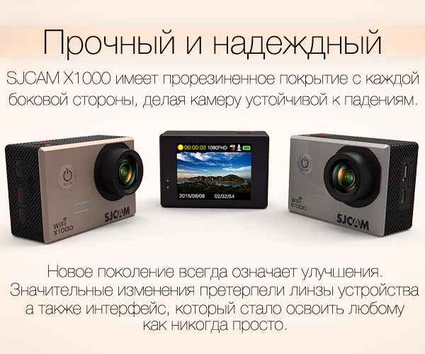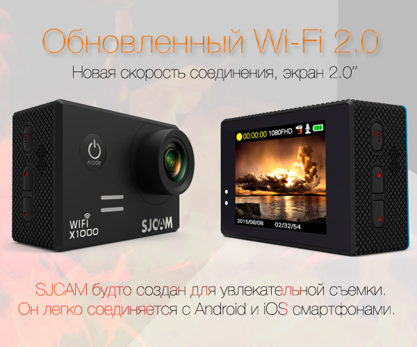 Экшн-камера SJCAM X1000 WIFI это переиздание легендарной модели SJCAM SJ4000 в отличии от своего старшего брата X1000 имеет WiFI и позиционирутся как бюджетная альтернатива. В новой экшн камере SJCAM X1000 WIFI такой же сенсор и чипсет как и у SJ4000, но в отличие от моделей него и SJ5000 имеет 2-х дюймовый дисплей.Угол обзора объектива составляет 170°. В SJCAM X1000 встроен WIFI модуль, который позволяет управлять камерой с мобильного устройства работает как с Android, так и iOS.